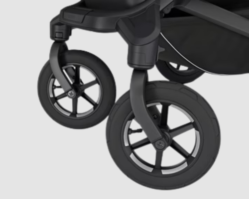 Плавный ход обеспечивают надувные колёса и эффективная амортизация — коляска мягко проходит бордюры и неровности. Поворотные передние колёса легко маневрируют в городе, а при необходимости фиксируются для более стабильной езды на скорости или по сложному покрытию. Для контроля движения на спусках и любом рельефе предусмотрен поворотный ручной тормоз (twist hand brake) — скорость регулируется плавно и уверенно.